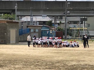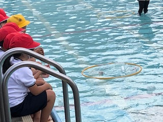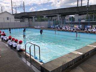 1年生がプールの外にいます。今から「水に親しむ時間」です。プールでは最初に「救助法」の学習です。他学年と同じように少し水が入ったペットボトルを溺れかけている人に見立てたフラフープに投げ入れます。1年生はプールサイドに座って投げ入れました。
