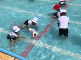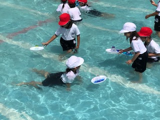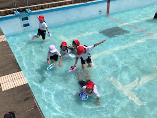 子どもたちは舟を浮かべたり、進ませたりして、舟の後からワニさん歩きで舟について行ったり、生き生きと活動しました。