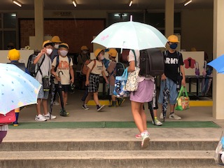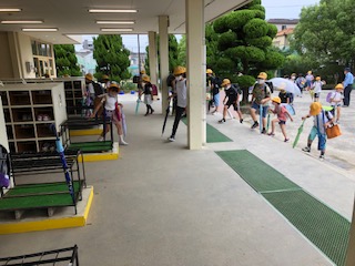 朝の登校、下足前の様子です。雨パラパラの中、子どもたちは元気に登校しています。