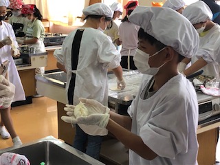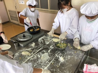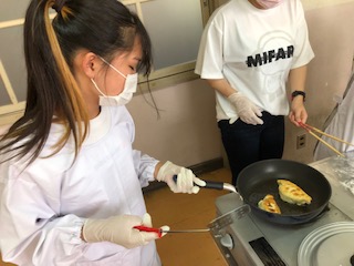 丸く伸ばした皮にこんもり盛って包んだら、フライパンで焼きます。みんなビニールの手袋をつけての調理実習ですが、器用にきれいな特大餃子が次々に形になっていきます♪
