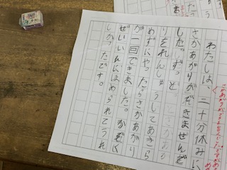 2年生の1クラスは、作文を書いています。素敵な作文を見つけました。私(校長)もさかあがりが苦手でやっとできるようになったので、気持ちが重なりました♪