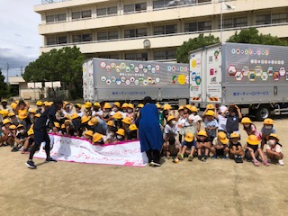 子どもたちは感謝状と自分の絵のマグネットをいただき、最後にトラックと記念撮影をしました♪ カラフルに学校の名前や1年1組と書かれており、しかもほっこりする絵とメッセージ。是非どこかでこのトラックたちに出会いたい!と強く思います!!