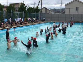 今年のプール授業の締めくくりは2年生です。壁につかまって頭をつけると真ん中に出てきて頭まで潜ります。それからジャンケンで負けた方がお地蔵さん、勝った方はお地蔵さんにたっぷりの水をかけてあげます♪