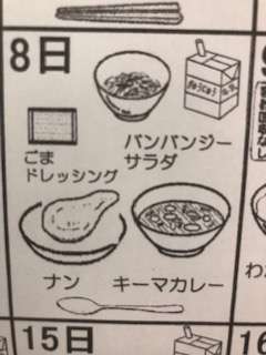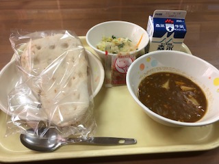 今日の給食は、子どもたちに断トツ1番人気のカレーです。今日はインド風にナンです。バンバンジーサラダがキリッと引き締めます♪