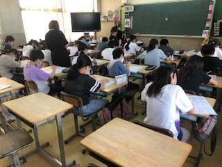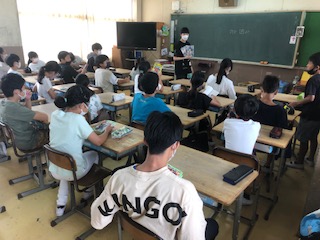 6年生の教室です。1クラスはこれから図書室へ行くところ、夏休みに借りた本を返します。1クラスは算数「データの見方」のプリントに向かっています。真剣に集中しているのがよく伝わってきます。1クラスは社会「武士の政治のはじまり」です。ちょうどNHK大河ドラマ「鎌倉殿の13人」、を見ていて歴史は知識ですが、その流れは、たくさんの人々ががそれぞれの思惑を重ねて大きなドラマになるんだな、と裏話に驚きながら見ているところです。子どもたちもドラマで理解するとわかりやすいです。