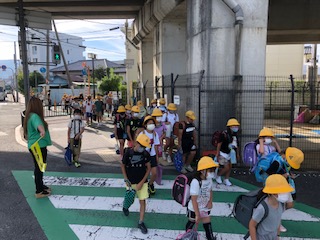 新しい週の朝、子どもたちは青空の下、見守り隊や黄ママさんたちに見守られて元気に登校して来ました。