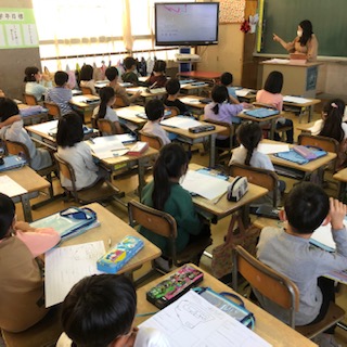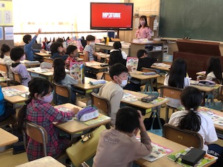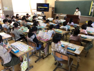 2年生では2クラスが音楽、世界の楽器を知ったり、鍵盤ハーモニカて曲を弾きます。1クラスはクイズのようで楽しい学習です♪