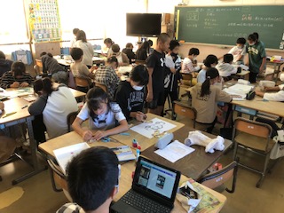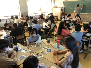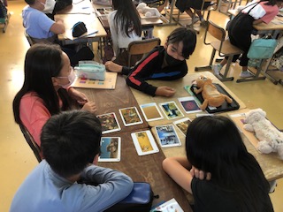 5年生の教室です。1クラスは自動車について、ニッサンの出前授業での気づきを取り入れながら、自分で車を設計したり、納期など、自動車産業に関わる知識を深めています。1クラスは美術鑑賞で、班ごとに異なるアートカードを見て、気づいたことや感じたことを交流しています。