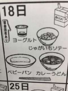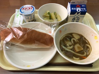 珍しいメニュー、カレーうどんです。あっさりした食感のうどんにカレーをからませて美味しくいただきました。じゃがいもソテーはほんのりバター風味があり、ヨーグルトまでついていてリッチな献立でした♪