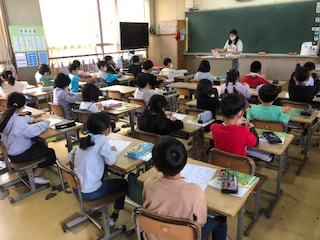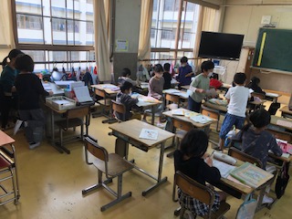 2年生の教室では、1クラスは算数で足し算引き算ミックスの計算プリントに取り組んでいます。1クラスは視力検査も入っているので、教室の人数が少なく、これまでのやり残しなど学習の整理です。そして1クラスは進出漢字を習い、その字を使った言葉集めをしていて、一斉にたくさんの手が上がります。