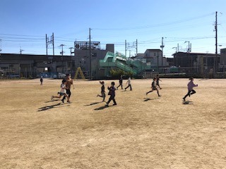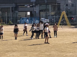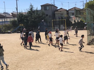 中休みの終わり、上級生と一緒に低学年がいたり、駆け戻る子どもたちの中に、外に出て一緒に遊んでいた先生たちがいたりします♪