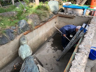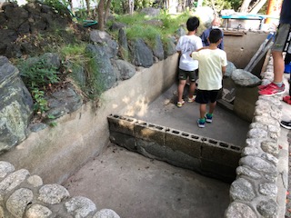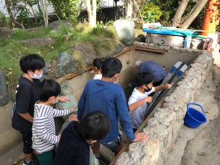 金魚の池を、何人かの教職員で何日もかけてきれいにあけました。金魚たちは一時避難しています。ヘドロが底に厚く溜まっていたのもすくいだして、みんな初めて底を見ました。子どもたちが入ってみています。電動ポンプも古くて使えなくなっていました。またきれいな水を張って、ポンプも新しくして、金魚たちの快適な住処を整備したいと思います♪