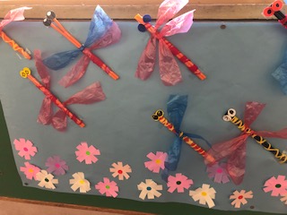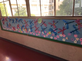 校内の掲示に、支援学級の合科で子どもたちが秋の作品を掲示しています。カラフルなトンボたち、よく見るとみんな表情が違っていて楽しいです♪