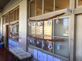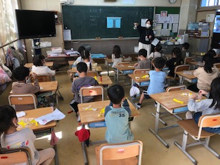 1年生の1クラスでは「秋の木」をテーマに紅葉したカラフルな葉っぱづくりで、色紙をちぎっています。廊下にはミノムシの掲示がありますが、すっかりミノムシを見なくなりました。子どもたちはミノムシって知っているかな?