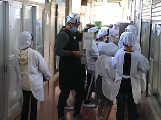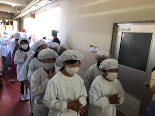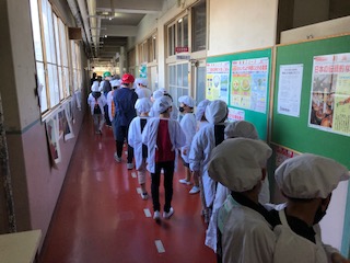 お昼時は給食当番が大活躍です。手早くエプロンをつけて給食調理室へ。順番が来たらクラスの当番が一斉に手を合わせて「いただきます。」と調理員さんにあいさつをします。手分けをして自分の担当のものを受け取ります。