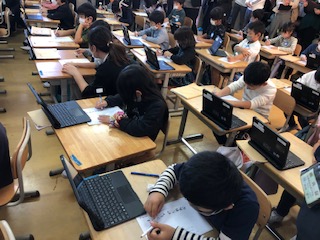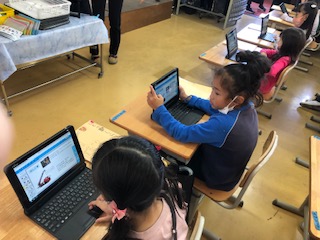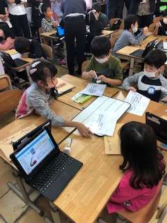 1年生の1クラスでは研究授業があり、大東中の先生たちも見に来てくれたので大勢の先生たちの応援を受けて、子どもたちは国語の学習に取り組みました。タブレットで調べて大事な言葉を確認したり、個々ではしご車のつくりをまとめて書いたり、班で交流したり、1年生がこんなにいろいろなことを自分の力でやりこなすことに驚きました!