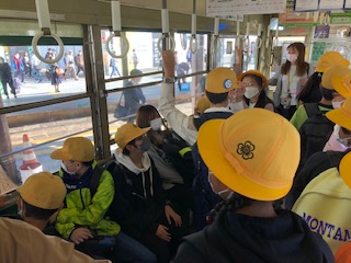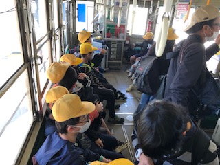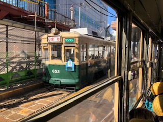 平和公園へは市電での移動ですが、私たちはカラフルな現行モデルではなく、昭和の時代走っていた緑色の市電での移動です。