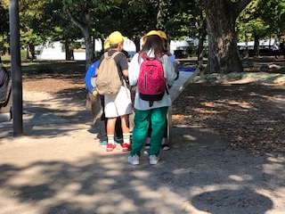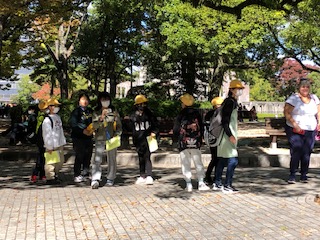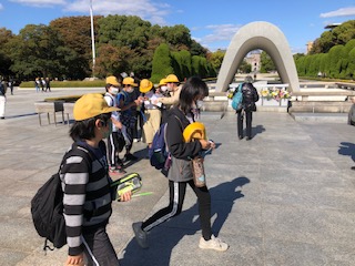 原爆ドームの方まで含めて広く公園内を子どもたちが探索しています。