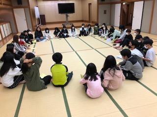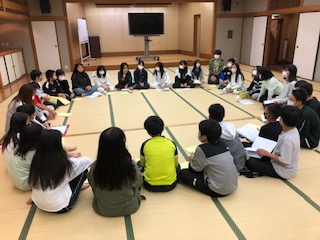 行動班長、生活班長、実行委員が集合し、班長・実行委員会議で今日の反省会がありました。1人ひとりの全員が自分の言葉で反省を述べました。100点満点の内、では60〜75点が多数を占めました。6年間最後の思い出づくり、100点にするために明日何をするかを考えて発表しました。