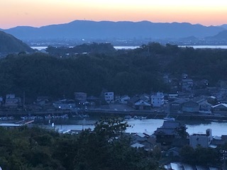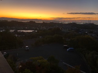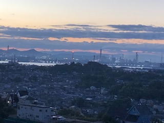 修学旅行2日目です。6時前、宿舎の部屋からの風景はまだ町全体が寝静まっている感じでしたが、15分ほどで明るくなってきました。高台にあるため、遠くに水島コンビナートを眺め、近くは町を見渡せます。お寺の鐘が聞こえてきました。どの部屋も子どもたちはよく寝ていました。子どもたちは起床です♪