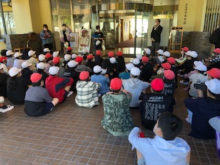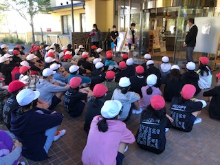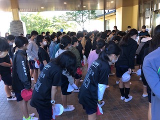 退館式が実行委員の進行で始まりました。実行委員長が代表して宿舎の方にお礼の言葉を述べます。食事がおいしかったこと、お風呂にみんなで入って楽しかったこと、みんなと一緒に泊まり、思い出になったことなどをしっかりと伝えました♪ その後帽子を脱いでみんなでお礼を言いました。立派な退館式でした。