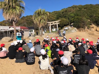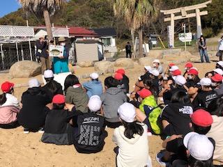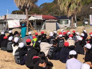 今から地引き網漁をするので、説明を聞きます。最後に毒のある魚の注意がありました。姫オコゼ、オコゼ、バリ、ゴンズイ、でも毒のある魚がいなくても、突然つかむと危ないとそうです。今日の昼食になります。みんなしっかり♪