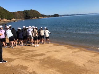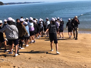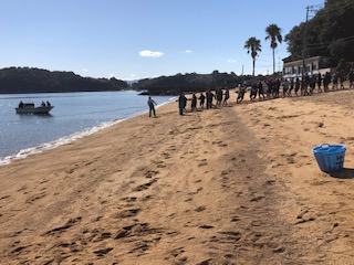 子どもたちは二手に分かれて網を引きます。網が砂浜に上がった分、一番後ろの人たちが水から上がったばかりの網を掴んで引きます。中にお魚が引っかかっていたりします。その間も海では魚がジャンプして逃げています♪