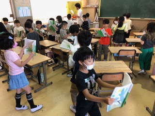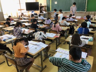 2年生の授業は3クラスとも国語、1クラスは「たんぽぽのちえ」の音読みで今日は楽しそうな句読点止まりの歩き読み、歩き方や読み方にリズムが出てきます♪ 2クラスは漢字、それぞれ「黄」「話」、その漢字を使った言葉集めをしたり、楽しく書き順や字のバランスをとったりして気持ちを込めて学んでいます。