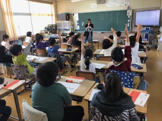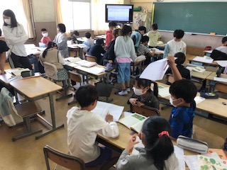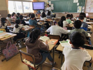 4年生は全クラス国語「アップとルーズで伝えよう」という説明文の学習です。2クラスは「はじめ」「中」「おわり」の3つにどこで分けるかを考えます。1クラスは、段落毎のまとめにワークシートで取り組んでいます。班で交流しながら進めています。