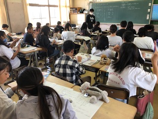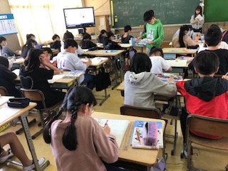 6年生の教室です。1クラスは分数のかけ算に取り組んでいます。1クラスは社会、日本の政治の仕組みを学習しています。真剣です。