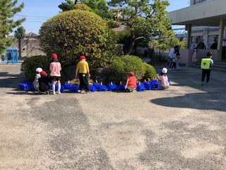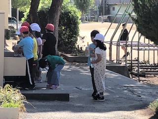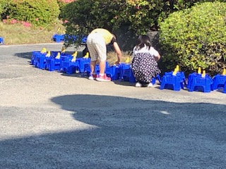 いつのまにか下足前の陽当たりの良い場所に植木鉢が並んでいます。朝の仕事は水やり、手洗い場で水を汲む列が見えます♪
