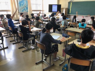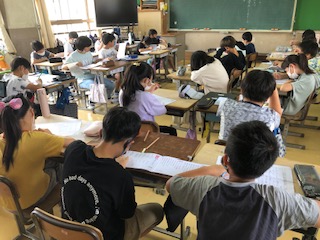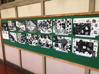 5年生の教室へ向かう廊下には白黒のきれいなアートが飾られています。1クラスは漢字のドリルを黙々と進めていて気持ち良い集中です。1クラスは「チクチクことば」「フワフワことば」、チクチクことばを出し合っています。フワフワことばに包まれるクラスがみんなイイはずです♪
