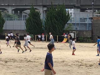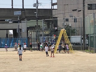 20分休はたくさんの子どもたちが運動場で元気に遊んでいます♪ 子どもたちは元気いっぱい。先生も走っています。