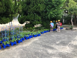 2年生のミニトマトは、実がたくさんなっていて、赤く色づくのが楽しみです♪ 下足から入ったところにクイズがあり、低学年の子が楽しく読んでいます♪
