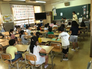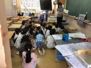 朝の1年生、教室で読み聞かせ、朝の会、提出物チェックです。
