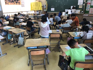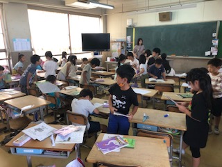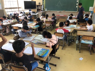 2年生は3クラスとも算数のプリントに取り組んでいます。配り係が配っているクラス、班で考え合うクラス、できたら先生のチェックを受けに行っているクラスです♪