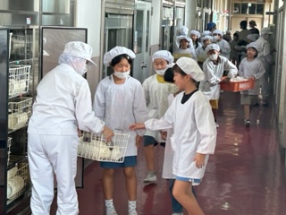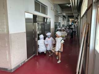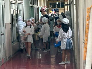 給食当番は手を洗って、エプロンをつけ、帽子に髪の毛を全部きれいに入れている人もいて、テキパキとなかなかいい仕事をしています。
