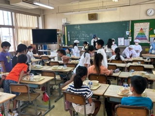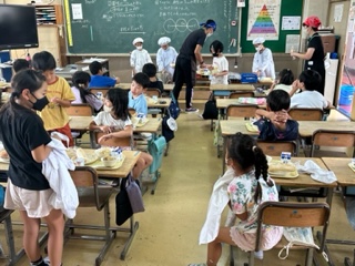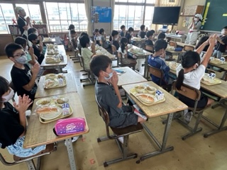 3年生の給食準備の様子です。配膳は、やはりカフェテリア方式です。前を向いて…丁度1クラスで「いただきます」の場面に遭遇しました。