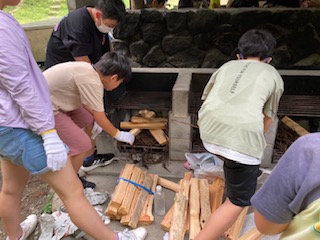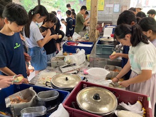 かまどの火の守りは大きな役目です。ひの大きさ、安定した火力、腕の見せどころです。一方で、カレーの材料、野菜の皮むきから、一口サイズに切ったり、分担します。