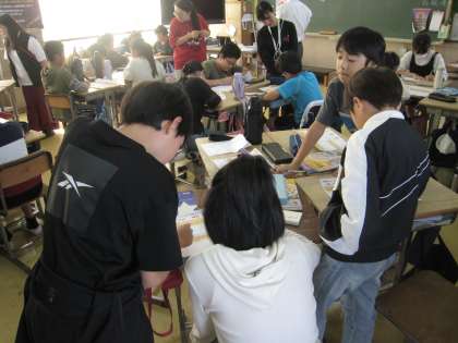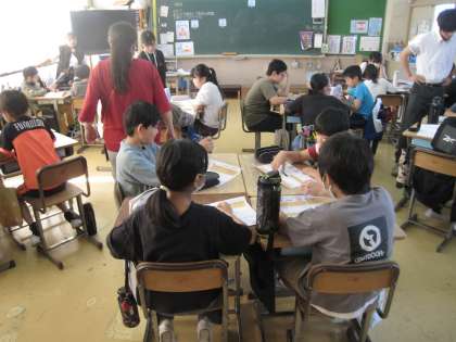 5年生の2クラスです。1クラスは算数の活用問題、ミッションインポッシブルに挑んでいます。班で考えていますが、頭を寄せ合ってとても真剣で5年生の学びへの成長を感じます。1クラスは音楽、先生の伴奏に合わせて歌っています。声の出し方がいいな、と味わいました。