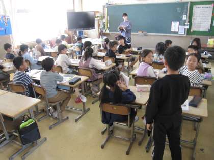 3年生の2クラスです。1クラスは国語で、発表者が一生懸命話すのをクラスのみんなが意識して聞いているのが見えました。学びに真剣です。1クラスは英語、英語のリズムのよい曲に合わせて振付があり、リズムにのって、楽しく踊って覚えます。
