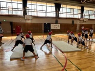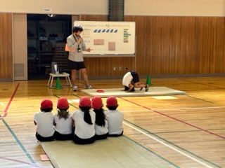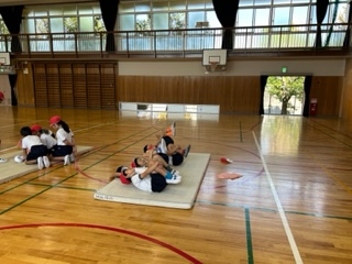 2年生の1クラスが体育館でマット運動です。1人が基本を押さえた後転を披露し、見事です。ポイントを確認すると、班ごとに準備運動やゆりかごで体を動きやすくしています。