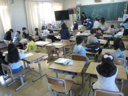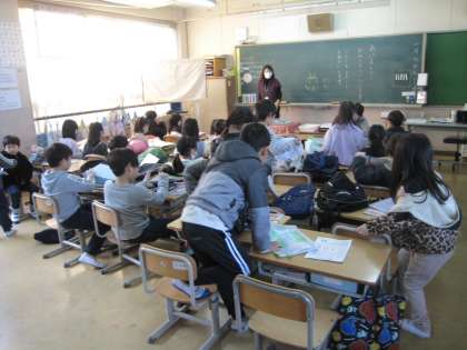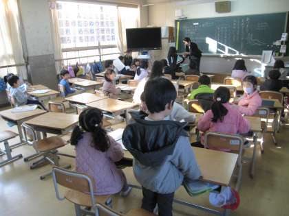 1年生の教室です。提出物を集めていました。出席番号順に持っていきます。1つ1つがスムーズに行えるようになってきました。先生がそれぞれ黒板に年頭のあいさつを書いているのがほっこりします。