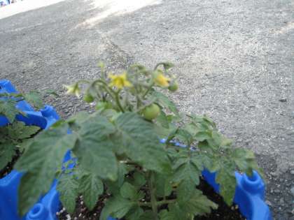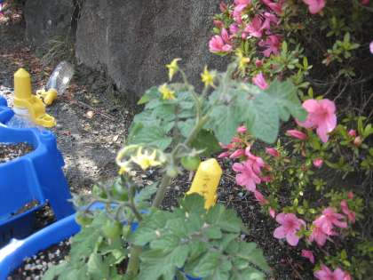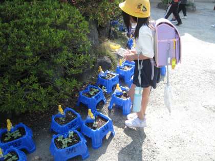 2年生が丹精込めて育てているミニトマト、実がなっている鉢もありますが、可憐な花を見つけました。黄色い小さな花が咲いています。1つひとつを子どもたちが愛でて世話しています。また、1年生はアサガオを植えていて、二葉がいっぱい出ています。こちらは1年生が水やりをしています。