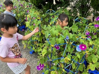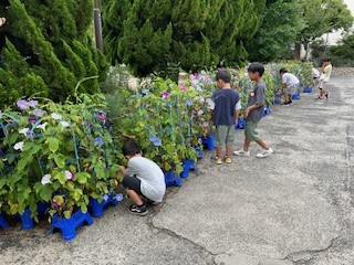 昨日朝の様子です。1年生が育てた朝顔が百花繚乱と表現したくなるような満開ぶりです。子どもたちも毎朝のように自分の植木鉢を観察し、お友だちと見合ったり、愛おしんで育てています。朝顔が立派に育ち、世話する子どもたちがかなり中に隠れて見えないほどです。今日から期末懇談ですが、玄関前で迎えてくれる朝顔の花軍団を味わっていただけます。持ち帰ってからも、まだまだ花が咲いて観賞していただけそうです。