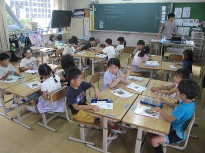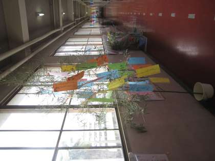 1年生の1クラスは、算数で2つのものの長さを比べてどちらが長いか考えます。廊下には、笹飾りに願いごとの短冊が賑やかに揺れています。残念!ホームページ作成時点では、縦写真でOKでしたが、アップすると横になってしまうようです。笹が寝てる画像になりそうです。