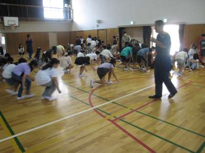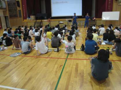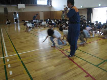 5年生の消防署の方の出前授業の後半では、火事の時にどう避難するか実地にやってみました。大人の腰のあたりまで煙が下りてくるので腰をかがめての避難です。みんな上手に中腰で移動してみます。最後に、みんなから出していた質問について、消防士さんの1日や何台消防車があるのですか、などに答えてくれました。「将来、消防士さんになろうかな、と思う人?」の質問には3人の手が上がりました。消防士さんたちがなぜその仕事を選んだのかはみんな一緒で「使命感」だそうです。ぜひ使命感を持って、消防士さんを志してほしいし、他の職業でも「使命感」を感じてほしいものです。
