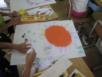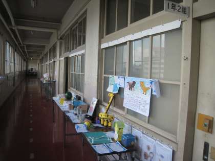 1年生2学級の夏休みの作品が廊下に並べられています。1年生ながら、創意工夫がゆたかです。教室の作品も写してみました。