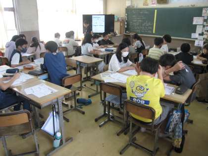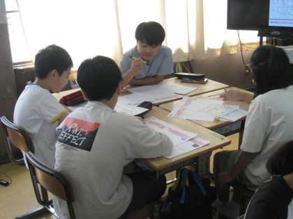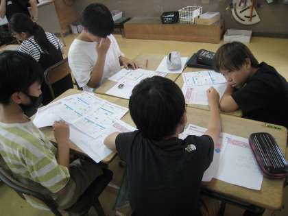 6年生の学びには手ごたえを感じます。算数の文章問題を班で考え合って解答への道を辿ります。パッと意見を出し合う前にじっくりと自分で考えるので、ゆっくりと時間が流れながらそこに集中を感じます。