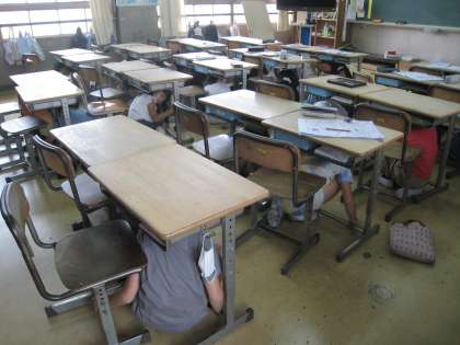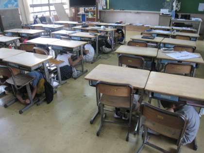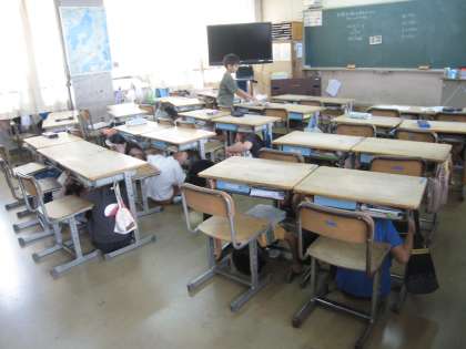 3年生が、どの教室もいません・・と思わず声が出そうにみんな静かに机の下にひそんでいます。大阪880万人訓練に合わせて、学校でも練習です。